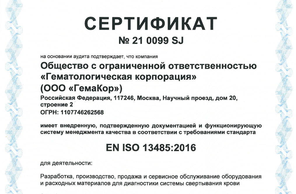 ГемаКор получил Сертификат СМК EN ISO 13485:2016